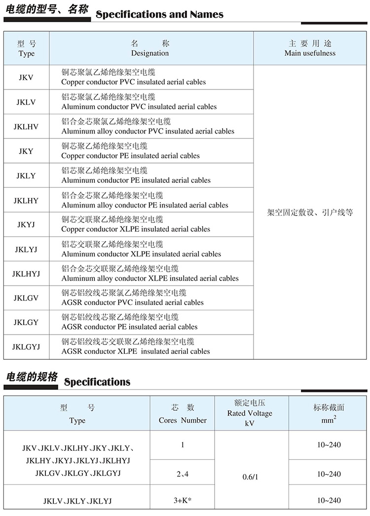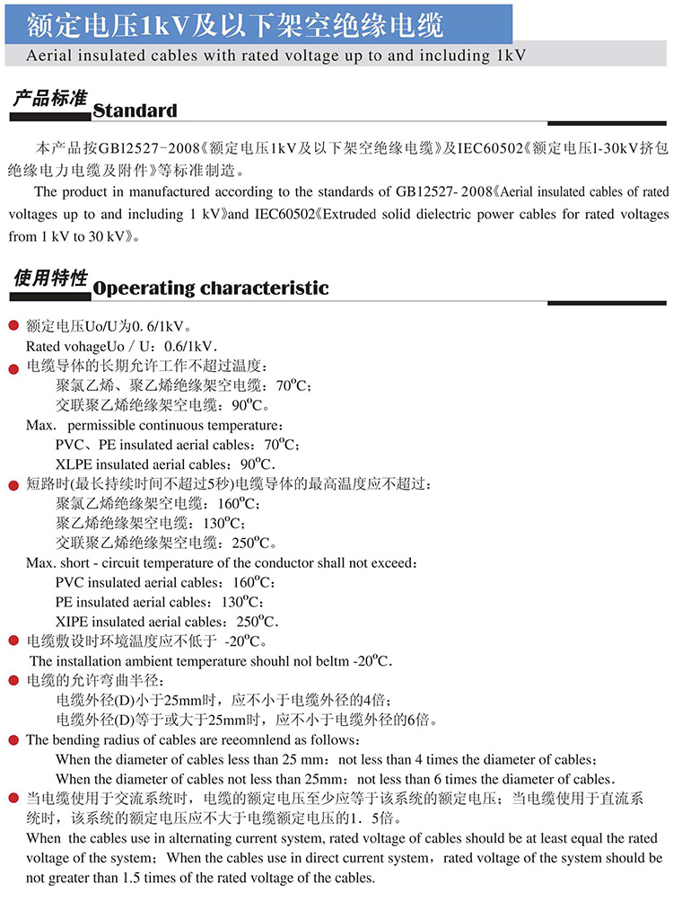 本产品按GBI2527- 2008《额定电压1kV及以下架空绝缘电缆》及IEC60502《额定电压1-30kV挤包绝缘电力电缆及附件》等标准制造。