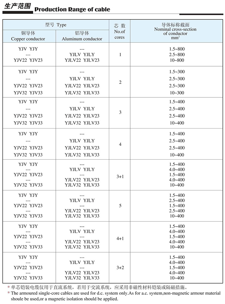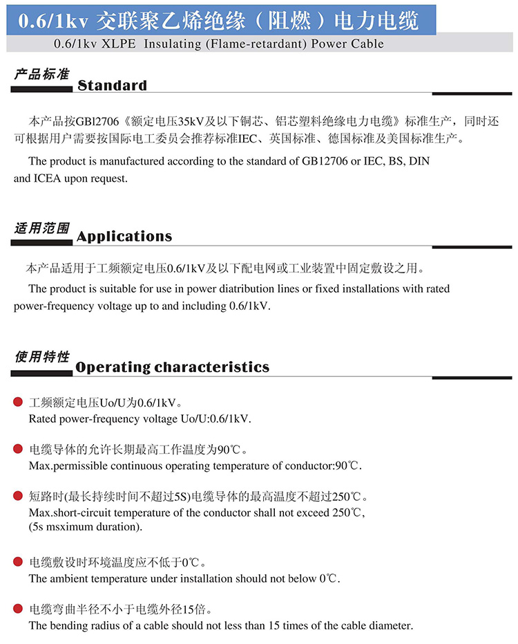 本产品按GB12706《额定电压35kV及以下铜芯、铝芯塑料绝缘电力电缆》标准生产,同时还可根据用户需要按国际电工委员会推荐标准IEC、英国标准、德国标准及美国标准生产。